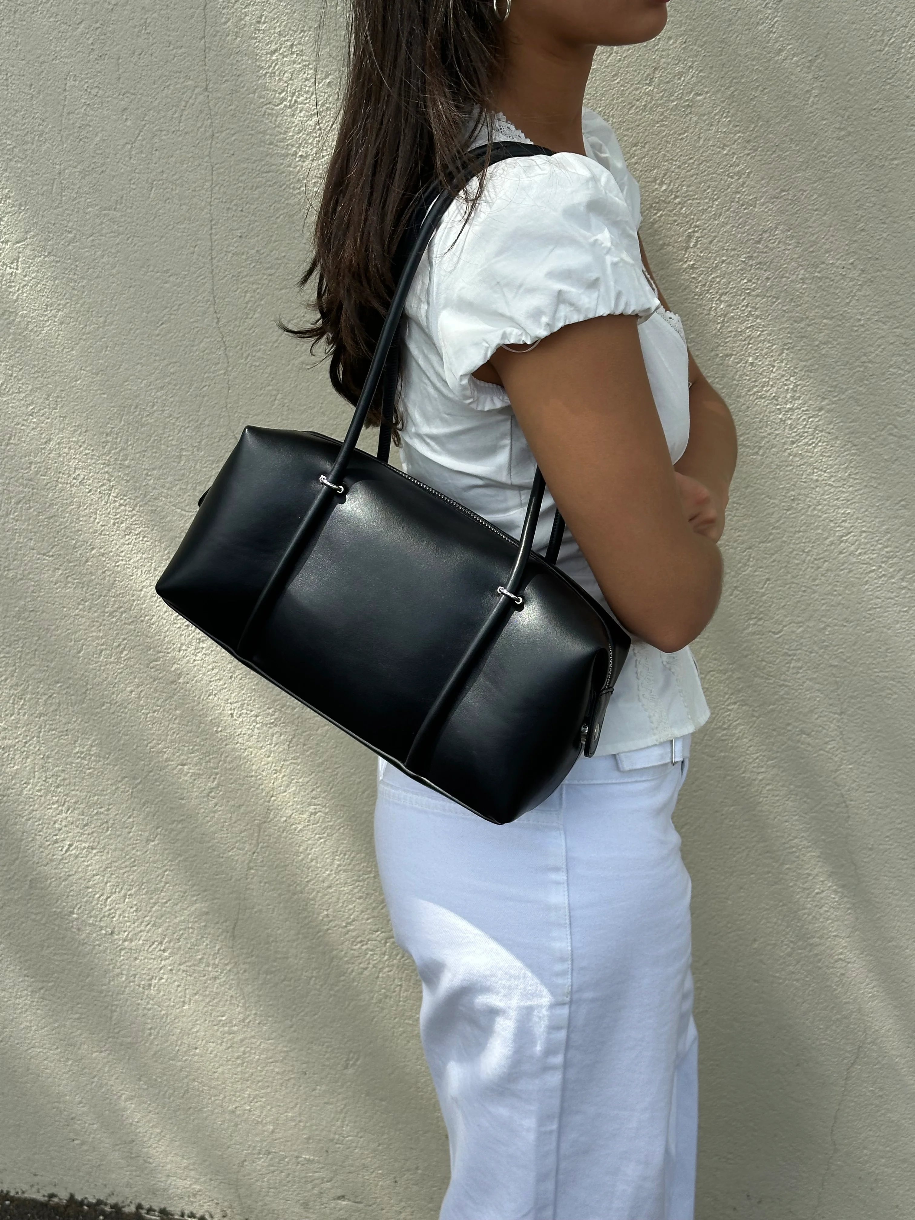 Coming in our Iconic Buttery Soft Vegan Leather with Long handles with Piping, strapped in by silver loops to allow for a chic yet timeless look.